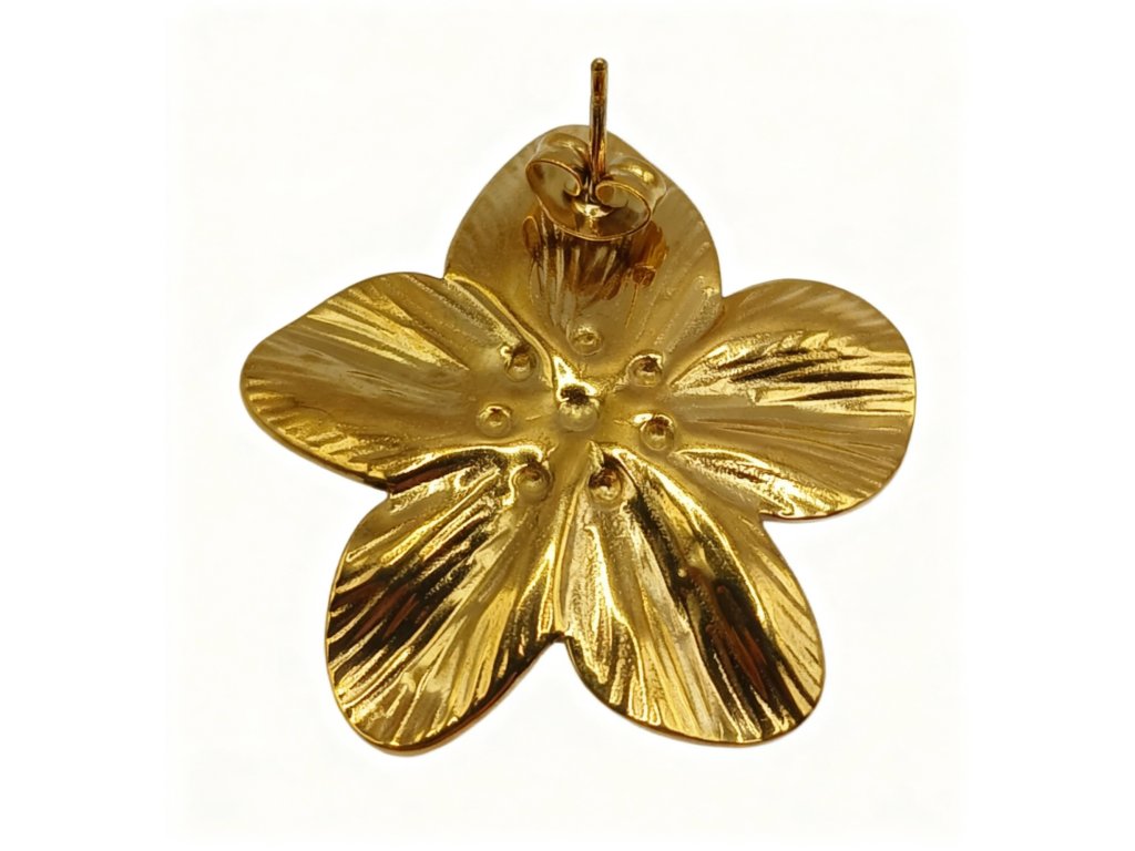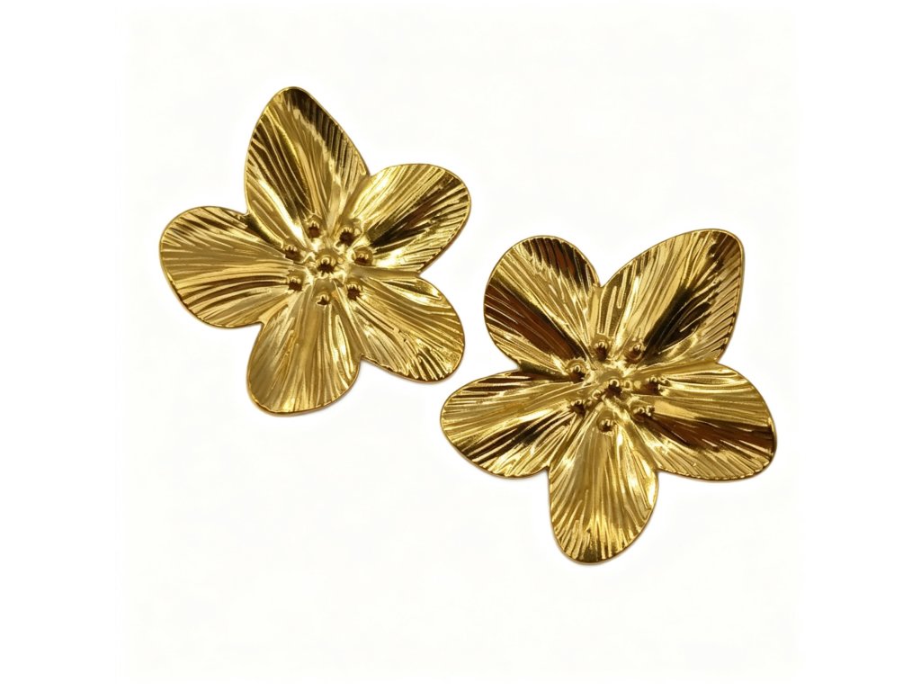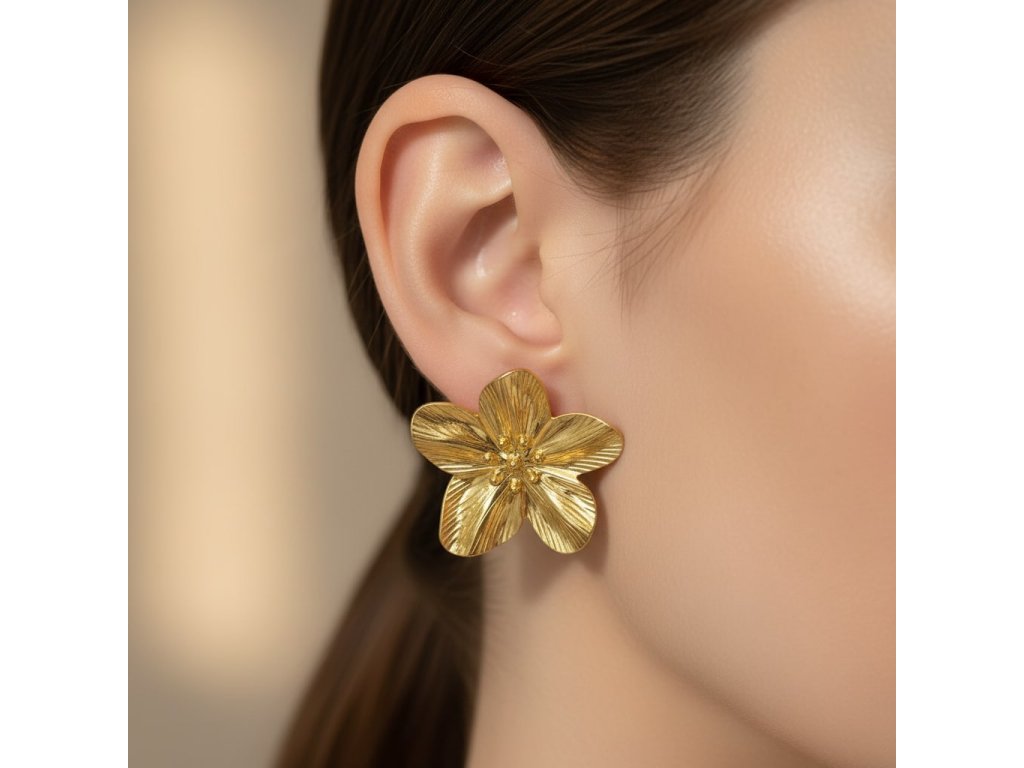 Zlatý povrch zvýrazňuje organické linie okvětních lístků a proměňuje náušnice v minimalistický statement šperk.