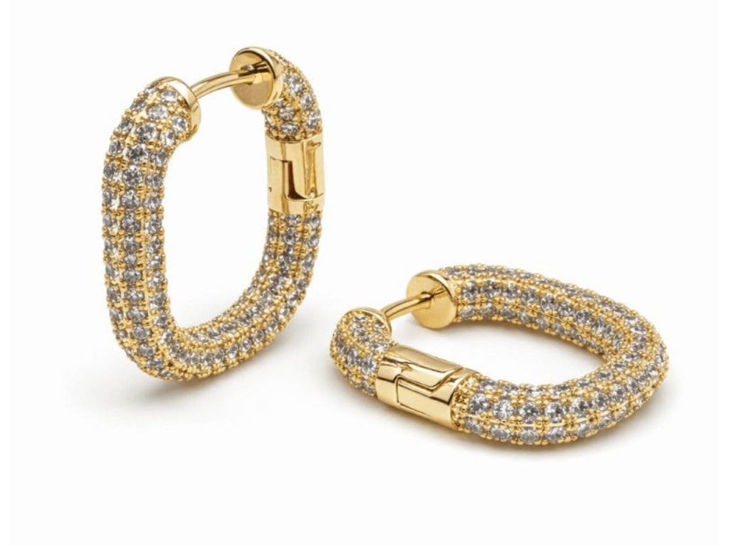 Víceřadé osazení zirkonů obepíná celý kruh náušnic a vytváří jemný, avšak výrazný glamour efekt.