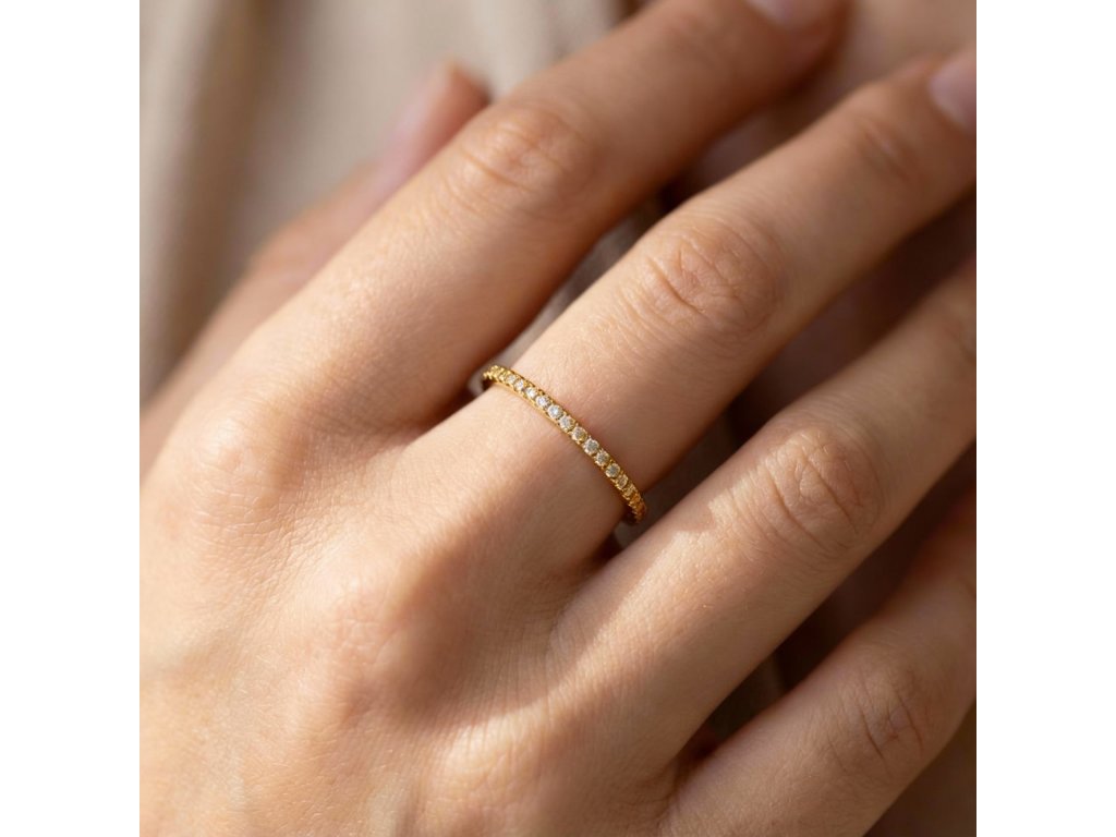 Souvislá linie zirkonů vytváří efekt nekonečného světla jemně zasazeného do minimalistického prstenu.