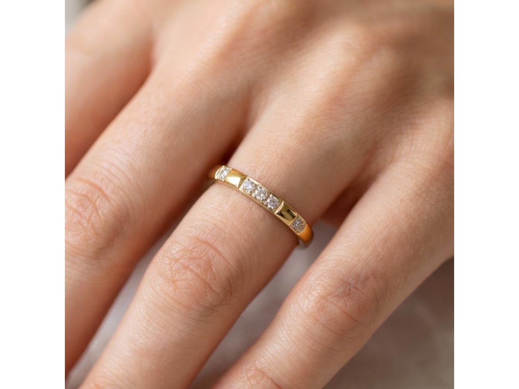 Lineární usazení kamenů vytváří decentní rytmus světla, který podtrhuje moderní a minimalistický design prstenu.