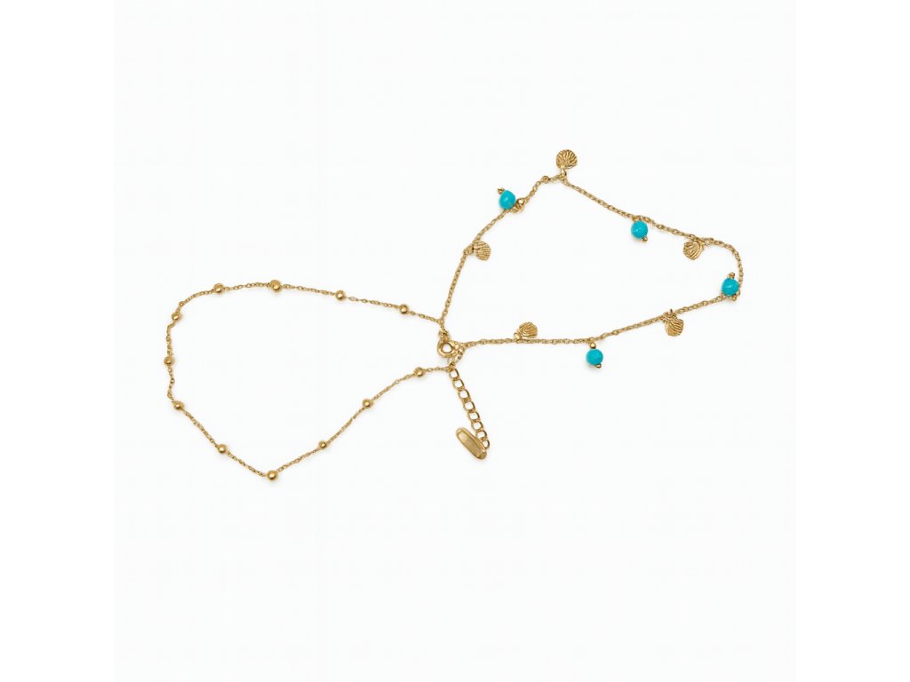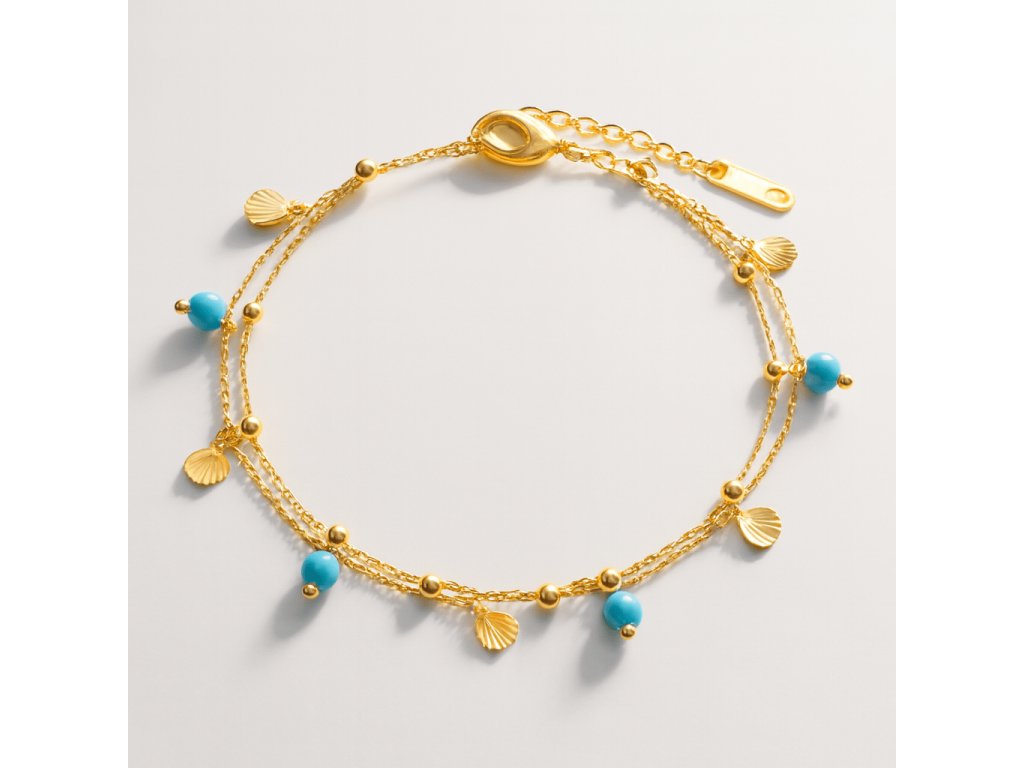 Minimalistický zlatý kotníkový náramek s tyrkysem a mušlovými přívěsky
