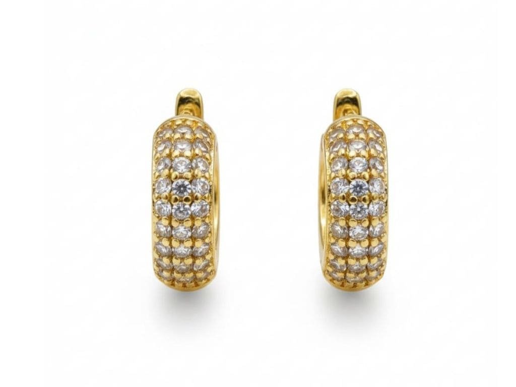 Zlatý povrch zvýrazňuje jiskru zirkonů a podtrhuje moderní módní styl.