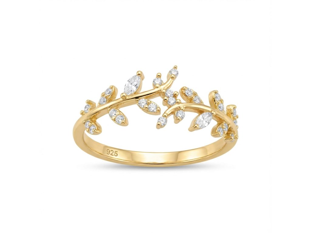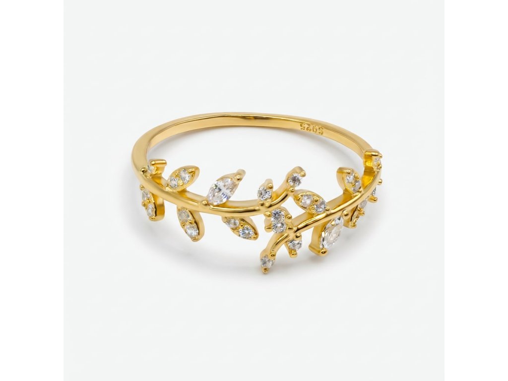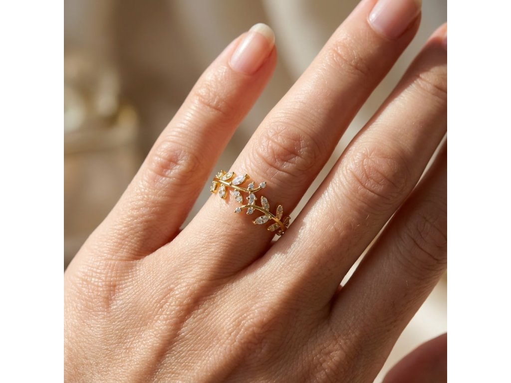 Zirkony jsou zasazeny do motivu olivové ratolesti, kde připomínají jemné světelné body zachycené v přírodní linii zlata.