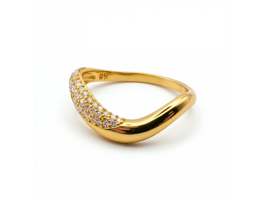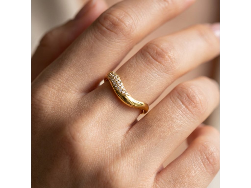 Zlacený povrch podtrhuje plynulý design prstenu a dodává mu jemnou, ženskou eleganci.